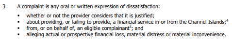 - An eligible complaint as defined at Article 7 of the Financial Services Ombudsman (Jersey) Law 2014.